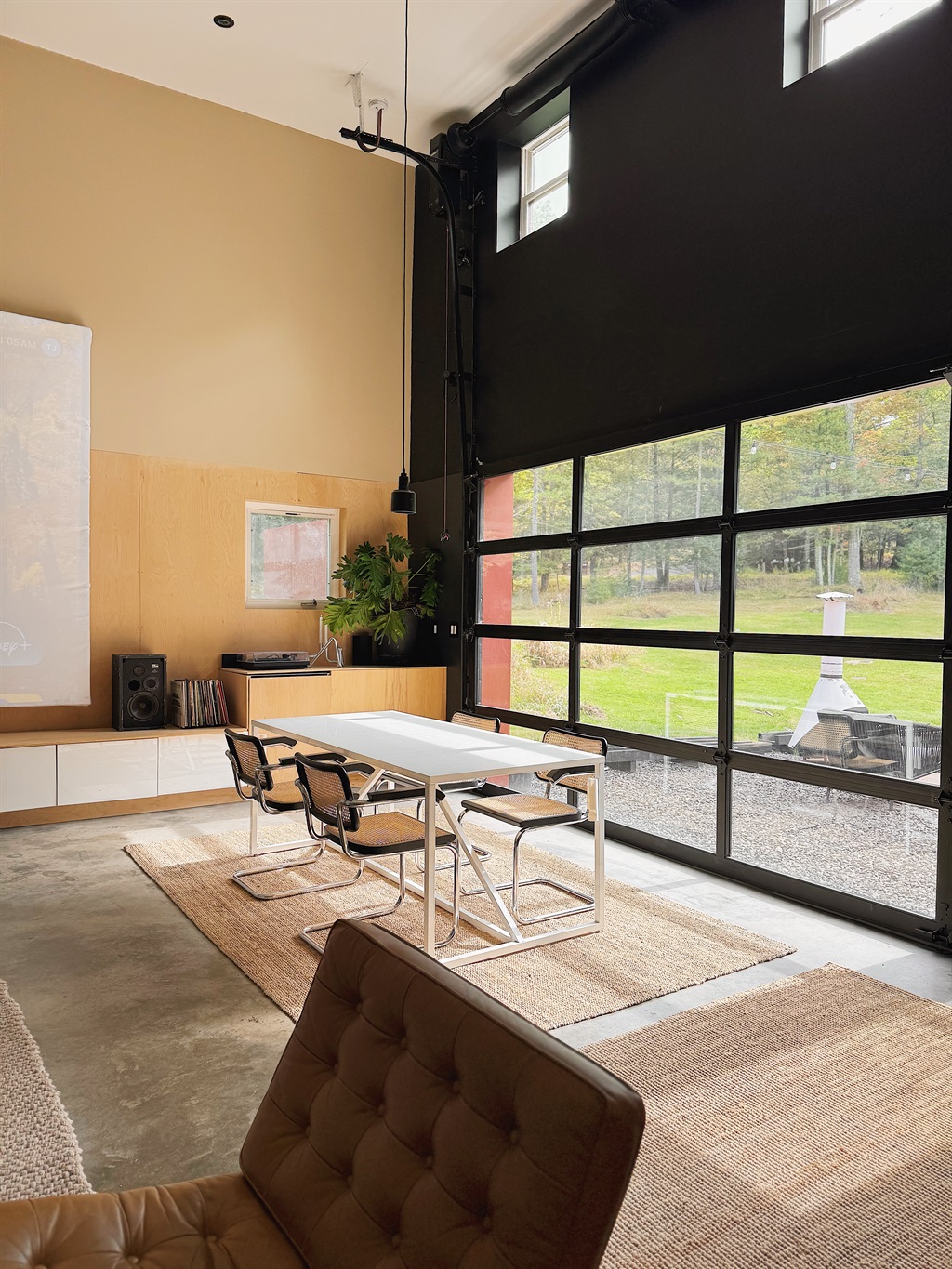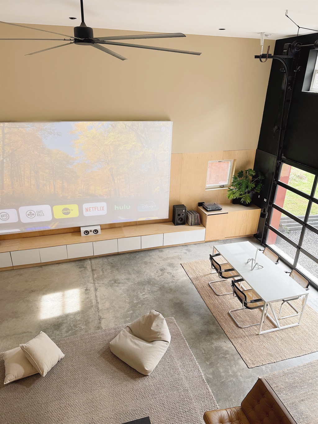 - Watching a film on the enormous projection screen while the glass garage door reflects the evening light