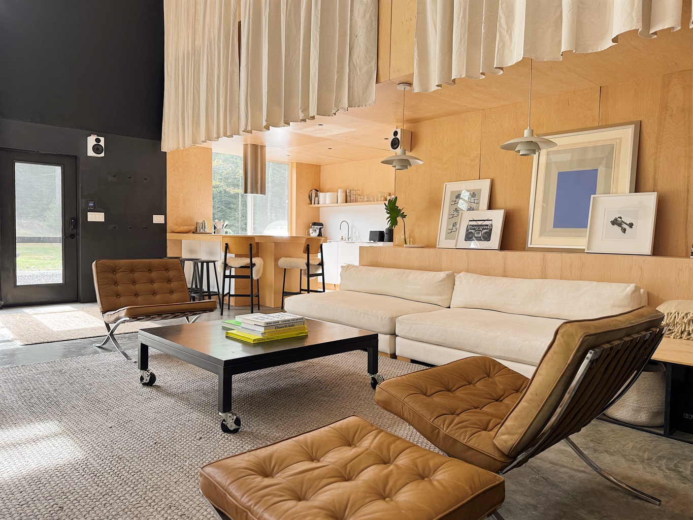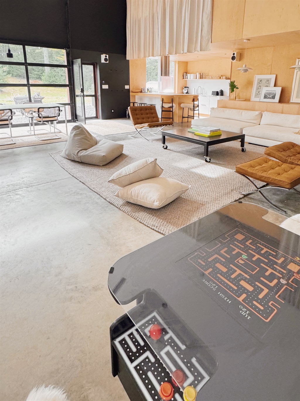 2 Bedrooms • 2 Bathrooms (1 full, 1 half) 2 Baths (1 full, 1 half) • Sleeps 1-4Spacious designer’s loft with 16 foot ceilings, a massive projection screen, and glass garage door overlooking a field and pine trees. Blending raw studio character with designer furnishings, an arcade table and a full kitchen.