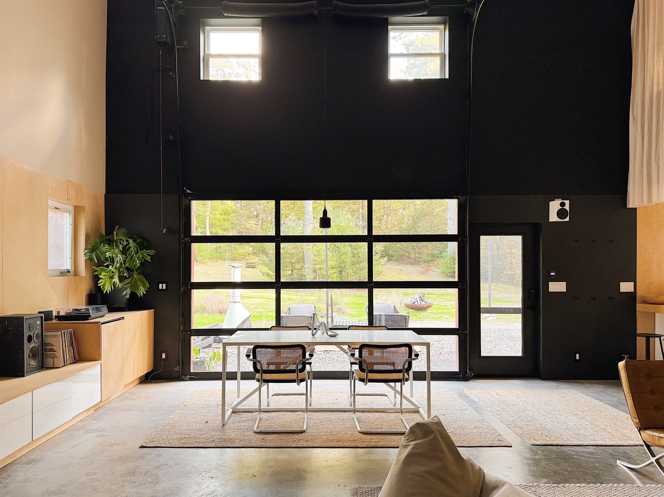 - Large glass garage door facing the field and forest.